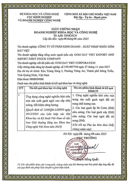 Ngày 06/6/2025, Công ty Cổ phần Kinh doanh – Xuất nhập khẩu Gốm Đất Việt chính thức được Bộ Khoa học và Công nghệ công nhận là Doanh nghiệp Khoa học & Công nghệ (DN KH&CN).