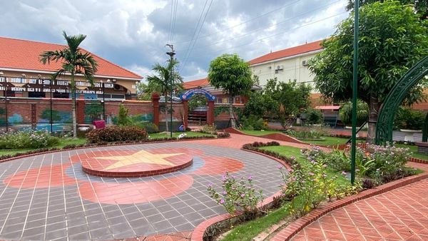Khuôn viên cây xanh trong nhà máy và là sân chơi của con công nhân ăn, học miễn phí tại Mầm non Gốm Đất Việt. Ảnh: Quang Mâu