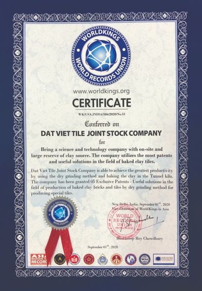Ngày 01/9/2020 tại Ấn Độ, Tổ hợp Công ty Cổ phần Gốm Đất Việt vinh dự được Tổ chức Kỷ lục Thế giới (WorldKings) công nhận hai kỷ lục quốc tế: