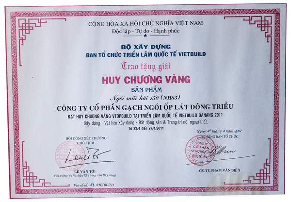 | 45 | Sản phẩm Ngói mũi hài 150 đạt Huy chương Vàng tại Triển lãm Quốc tế VietBuild DaNang 2011 |